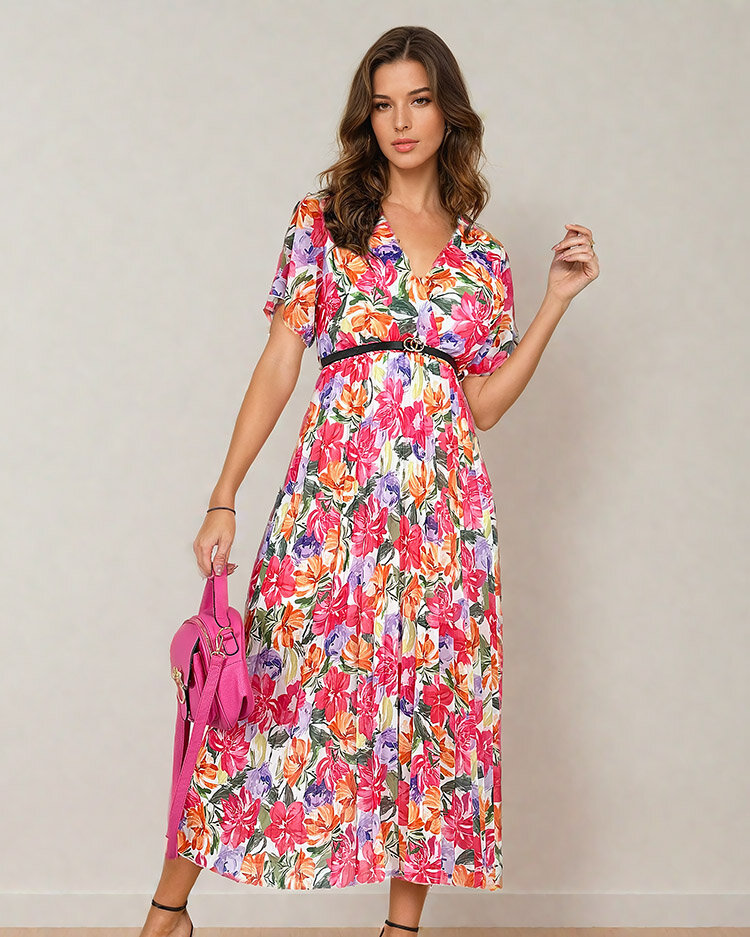 - Edinstvena ženska obleka iz lahkega materiala s cvetličnim vzorcem. Na višini pasu ima elastični trak. Izdelek je midi dolžine, ima kratke rokave in plisiran zaključek. Poleg tega je priložen pas. Občutite poletje v tem modelu!