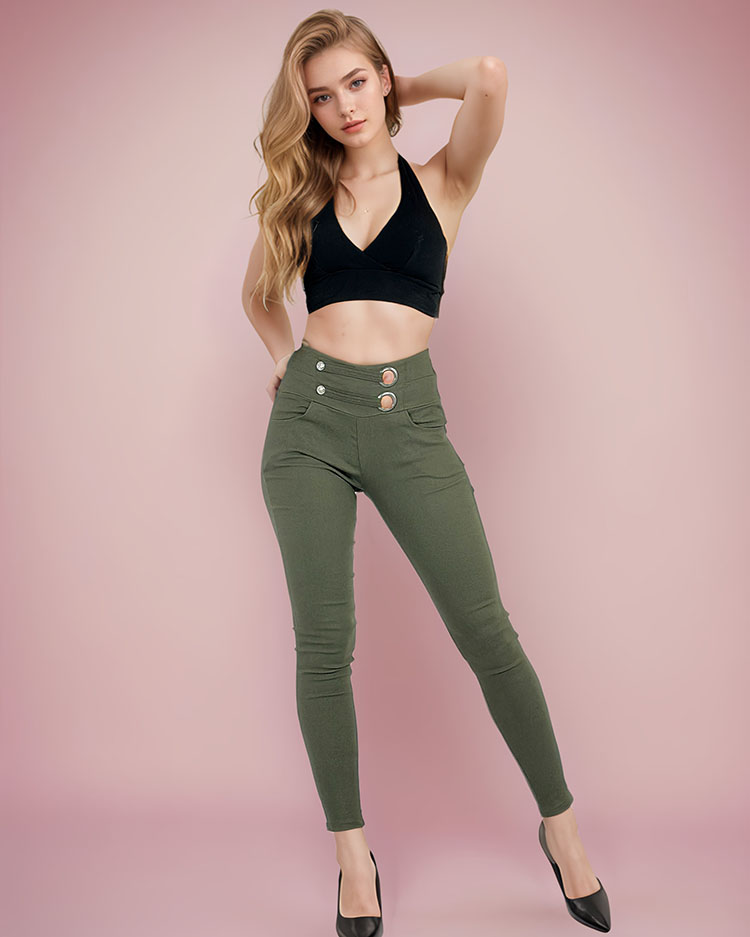 - Brezčasne ženske hlače z visokim pasom, izdelane iz raztegljivega materiala. Model ima visok pas, širok elastičen pas ter 2 žepa z naramnicami spredaj in zadaj. Odlične za vsakodnevno nošenje!