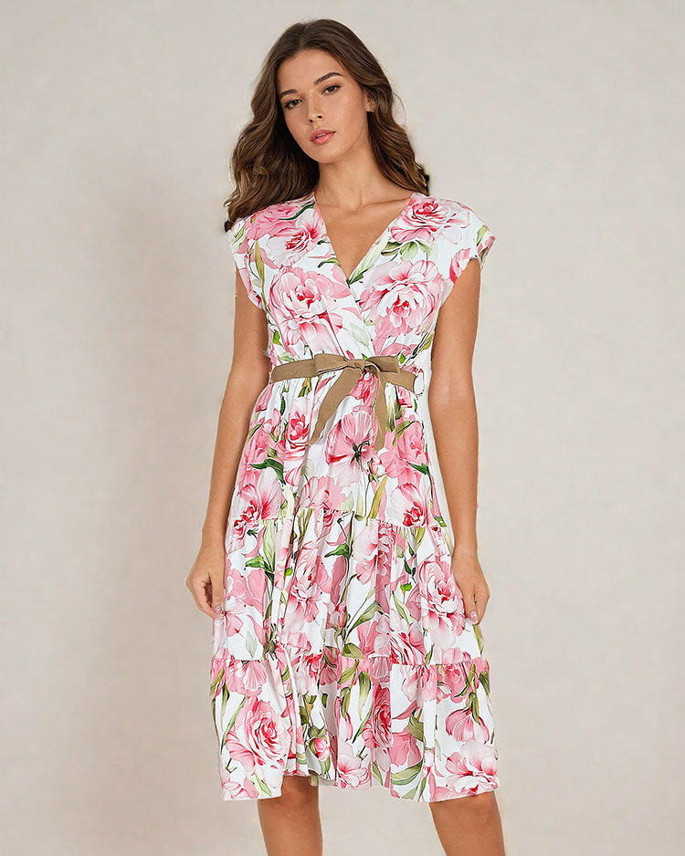 - Edinstvena ženska obleka iz lahkega materiala s cvetličnim vzorcem. Na višini pasu ima pas. Izdelek je midi dolžine, ima kratke rokave in je zaključen z volančkom. Občutite poletje v tem modelu!
