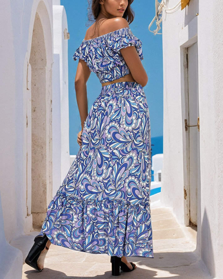 - Vzorčast ženski poletni komplet iz prijetne, lahke tkanine. Kratka majica v španskem slogu ima okrogel izrez in elastičen pas. Dolgo krilo ima elastičen pas in okrasne volančke. OPOMBA: Natančnost meritev (+/-) 1 cm.