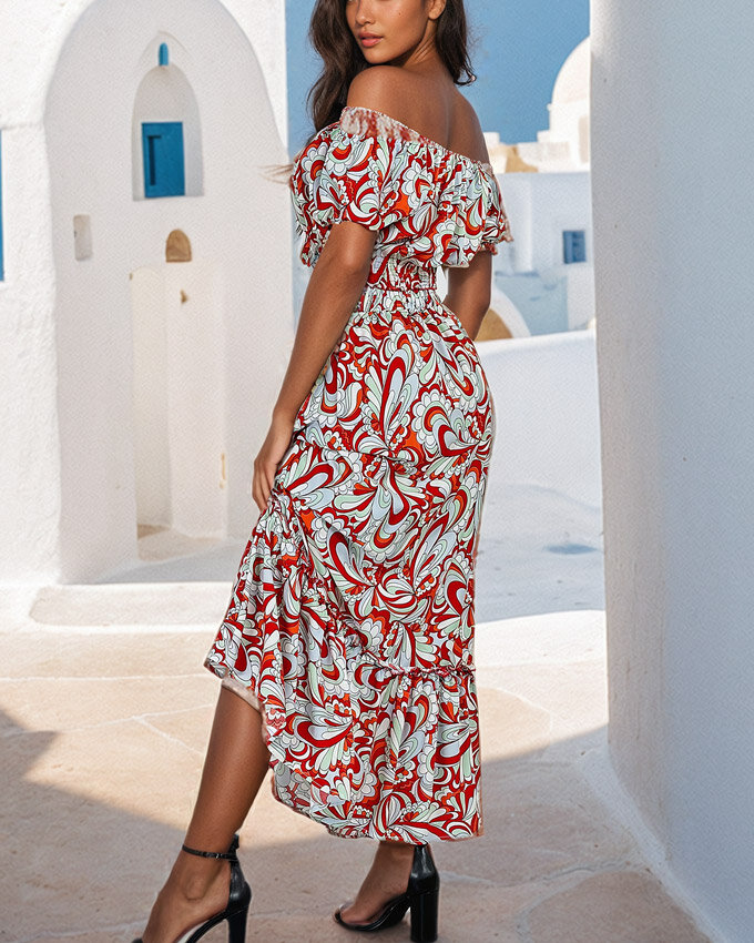 - Vzorčast ženski poletni komplet iz prijetne, lahke tkanine. Kratka majica v španskem slogu ima okrogel izrez in elastičen pas. Dolgo krilo ima elastičen pas in okrasne volančke. OPOMBA: Natančnost meritev (+/-) 1 cm.