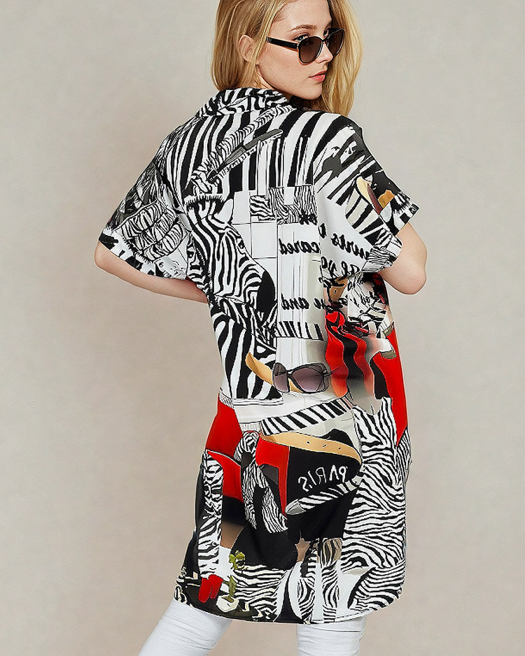 - Ženska vzorčasta tunika z V-izrezom in dolgimi rokavi. Narejena je iz prijetnega materiala. Model z asimetričnim spodnjim delom. Z njo začutite pomladno vzdušje!