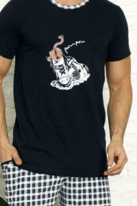 - Udobna dvodelna moška pižama s kratkimi rokavi in kratkimi nogami iz bombažnega materiala. Model je okrašen s potiskom. Odlična za domače večere! OPOMBA: Natančnost meritev (+/-) 1 cm.