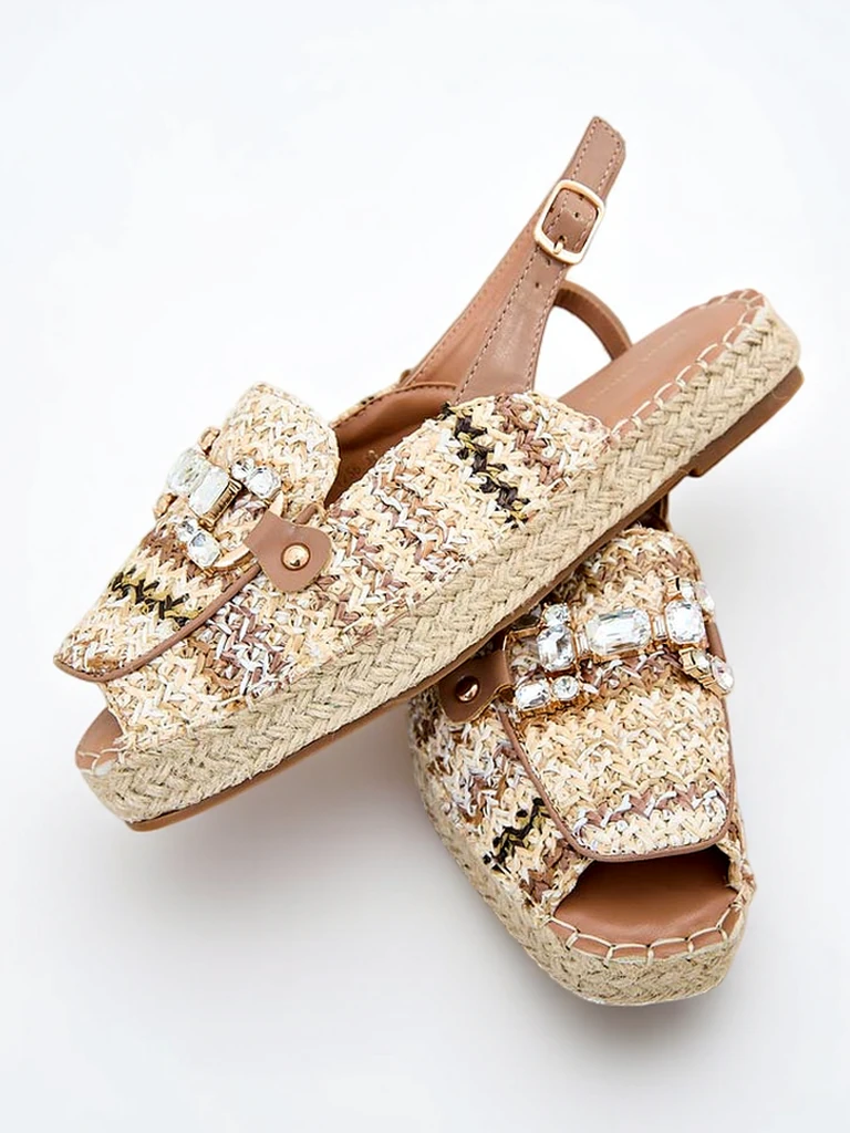 - Edinstvene ženske espadrile iz sintetičnega materiala. Ravni podplat, okrašen z vrvico iz jute, zagotavlja udobje. Model za obuvanje z usnjenim pasom in izpostavljenimi prsti. Odličen dodatek k poletnim oblačilom!