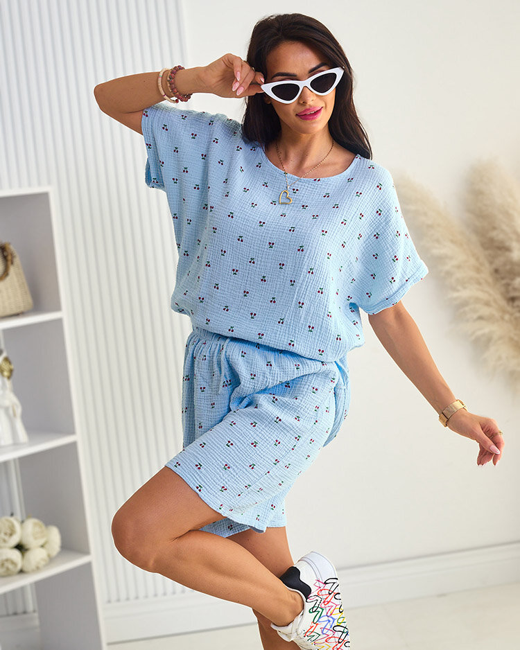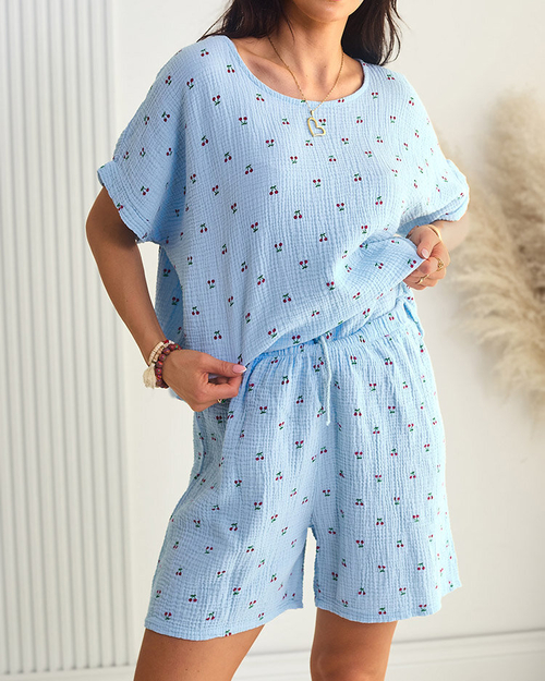 - Ženski komplet iz prijetnega materiala. Model ima okrasni potisk. Bluza s kratkimi rokavi in kratke hlače z elastičnim pasom. Občutite poletje v tem čudovitem kompletu!