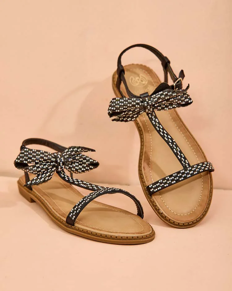 - Modni ženski ploski sandali, v celoti izdelani iz eko usnja. Zapenjajo se z zaponko, zgornji del pa krasi subtilen lok, ki jim doda prefinjenost. Odlični za poletne sprehode in posebne priložnosti!