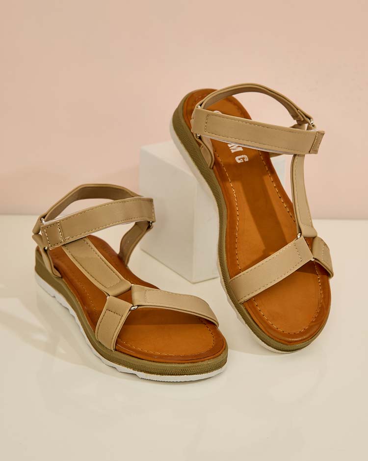 • Ženski sandali na ravnem okrasnem podplatu. Izdelani so iz prijetne tkanine, podplat je iz eko usnja. Obutev se zapenja z velcro. Odlični za ustvarjanje modnih poletnih oblačil!