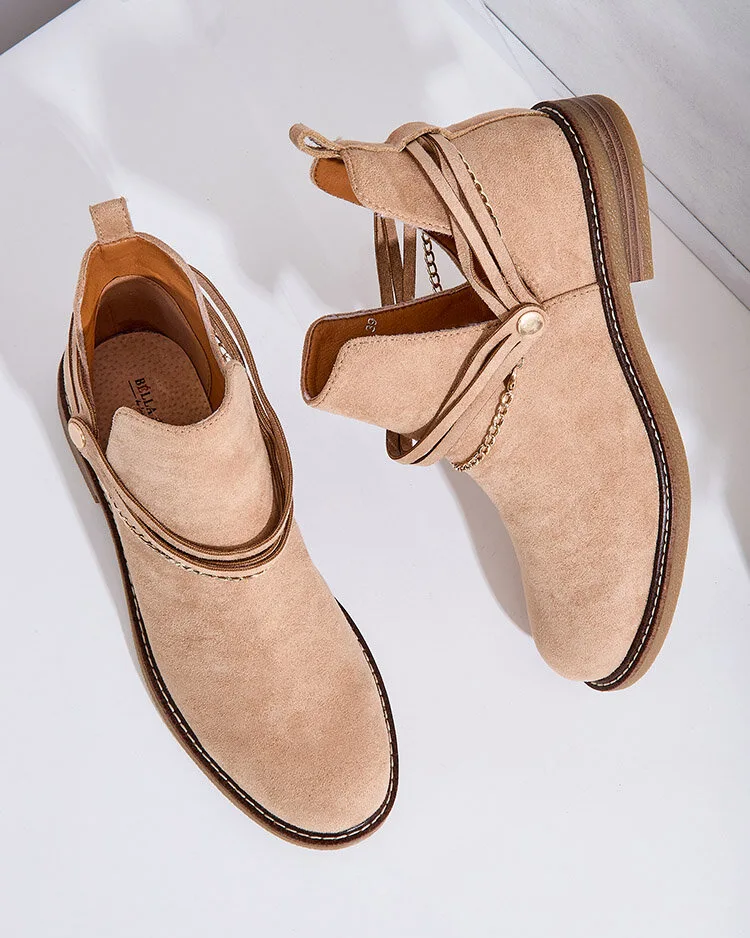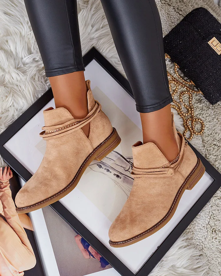 • Elegantni ženski škornji iz eko semiša z vložkom iz naravnega usnja so idealni za hladnejše dni. Model z drsenjem in okrasnimi verižicami na zgornjem delu. Obutev na ravni petah in z okroglim prstom. Super dodatek k vašim priložnostnim oblačilom!