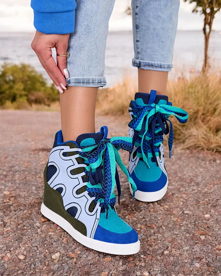 - Športni ženski škornji na petah iz kombinacije eko usnja in eko semiša. Obutev se zavezuje z okrasnimi vezalkami, v notranjosti je vložek iz eko usnja.