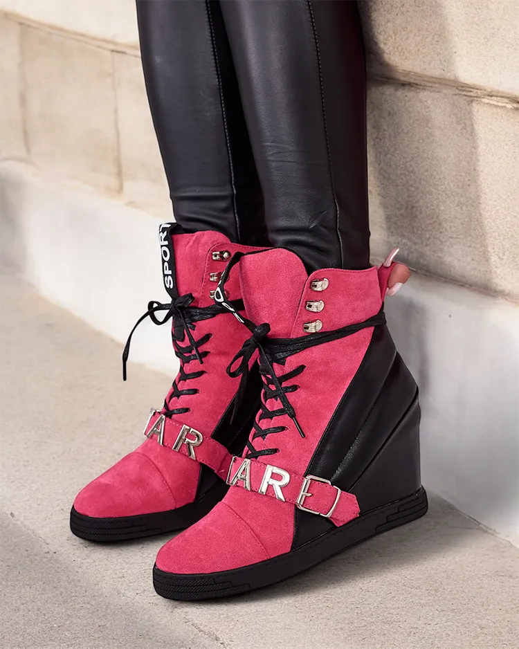 • Športni ženski škornji na petah iz kombinacije eko usnja in eko semiša. Vezeni čevlji z okrasjem na zgornjem delu, notranji vložek iz blaga.