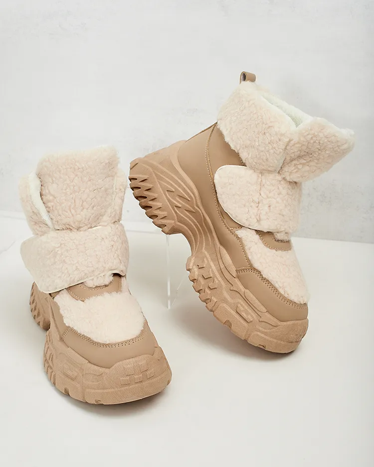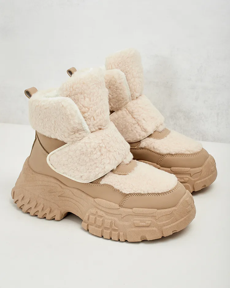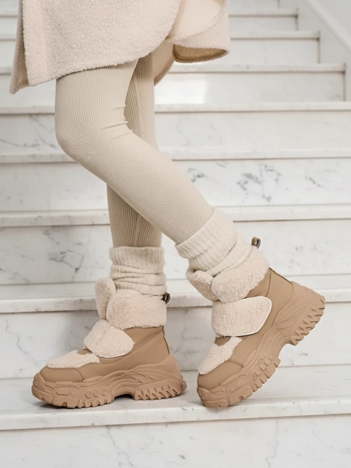• Brezčasni ženski snežni škornji. Zgornji del je izdelan iz ekološkega usnja z vložki a'la ovčja koža. Izolacija v obliki krzna v notranjosti, čevlji imajo zapiranje na velcro. Idealni za hladnejšo sezono!