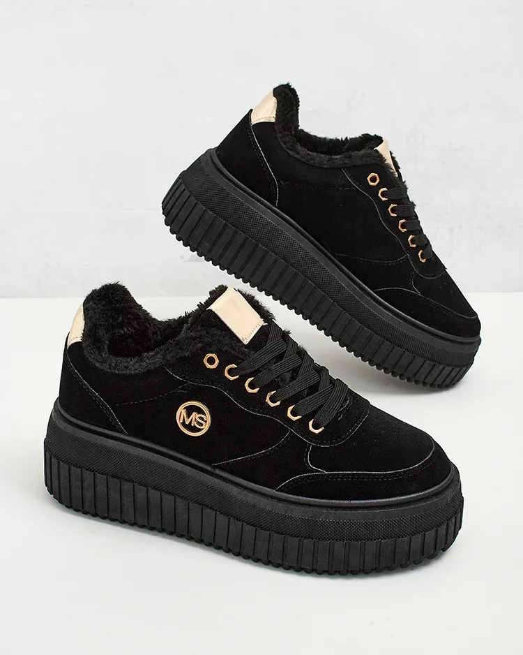• Ženske športne superge z debelejšim podplatom. Zgornji del z vezalkami, izdelan iz okolju prijaznega nubuka. Notranjost v celoti izolirana s krznom. Idealne za hladnejše dni!