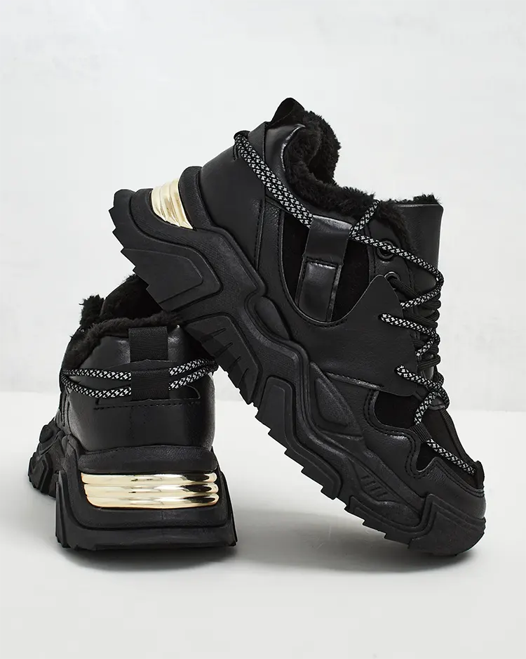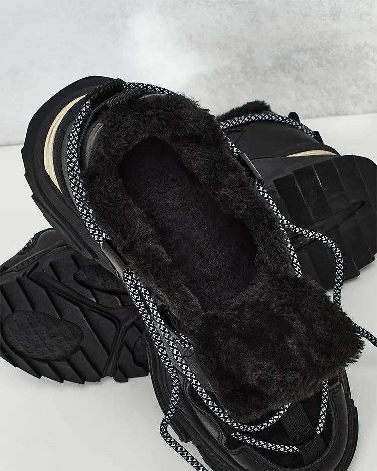 - Ženske športne superge z debelejšim podplatom. Zgornji del z vezalkami, izdelan iz ekološkega usnja. Notranjost v celoti izolirana s krznom. Idealne za športne obleke!