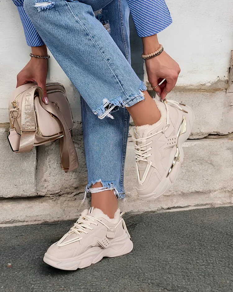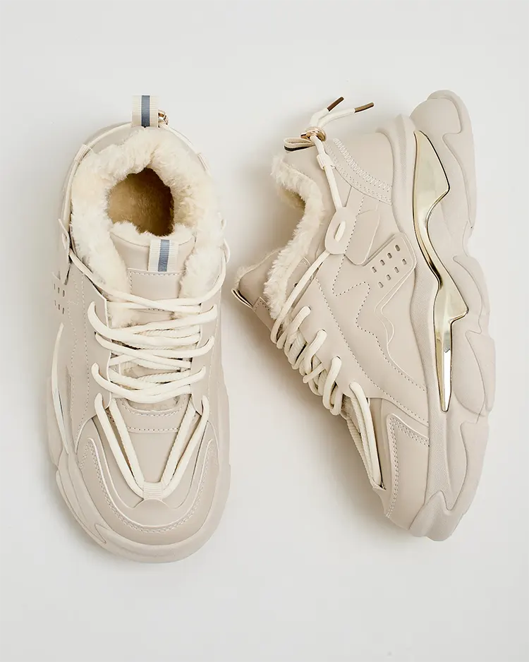 - Ženske športne superge z debelejšim podplatom. Zgornji del z vezalkami, izdelan iz ekološkega usnja. Notranjost v celoti izolirana s krznom. Idealne za športne obleke!