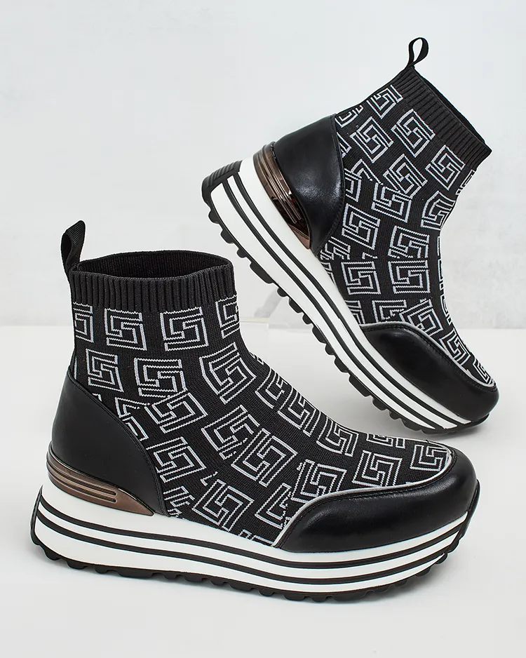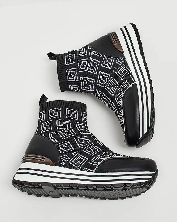 - Ženske superge z debelejšim podplatom - popolna kombinacija sloga in udobja. Obutev z drsenjem, izdelana iz tkanine. Model ima okrasni potisk. Dobra izbira za vsak dan!