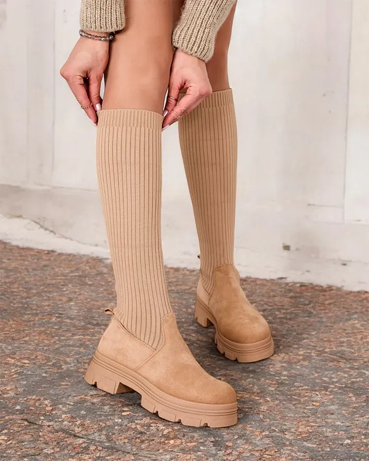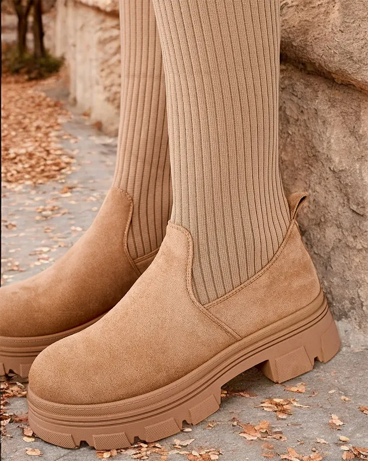 - Elegantni ženski škornji do kolen z ravno peto. Zgornji del je izdelan iz elastičnega tkaninskega materiala v kombinaciji z eko semišemom, v notranjosti je krznen vložek. Model za obuvanje. Odlični za vsakodnevne jesenske obleke!