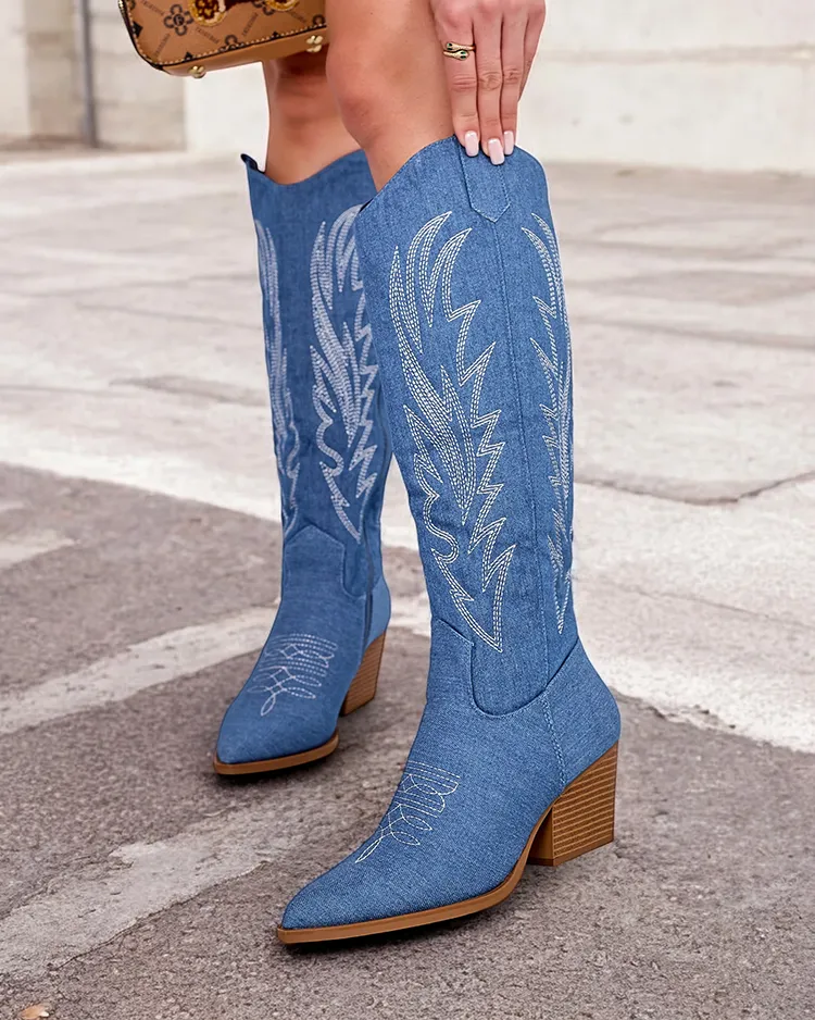 • Škornji a'la kavbojski škornji z nizko peto, izdelani iz prijetne tkanine z okrasnim reliefom. Vložek iz tkanine, škornji z zadrgo do sredine teleta. Prilegajo se številnim ženskim stajlingom!