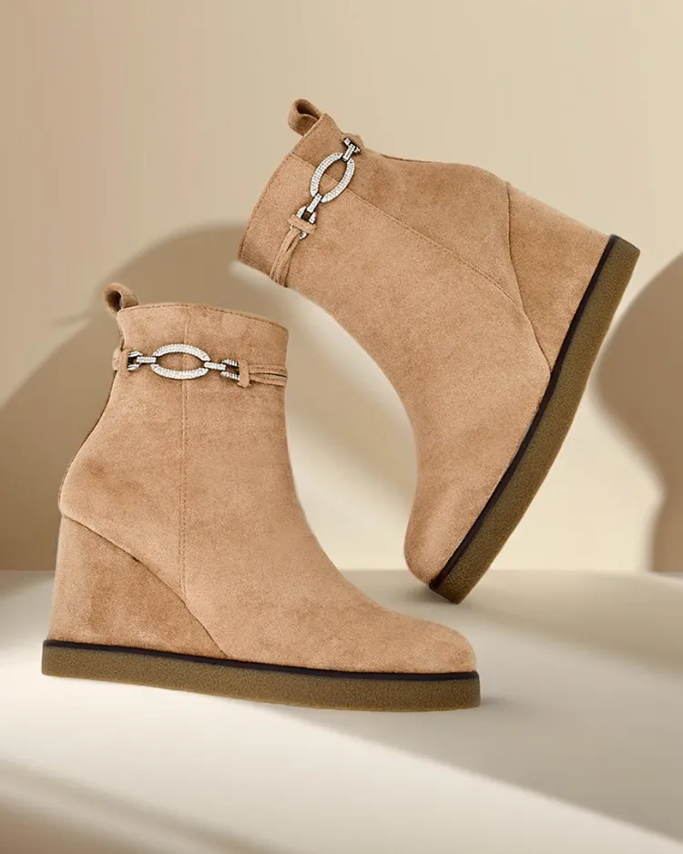 - Elegantni ženski škornji na petah iz eko semiša. Obutev je na notranji strani polnjena s krznom. Odlična izbira za jesen!