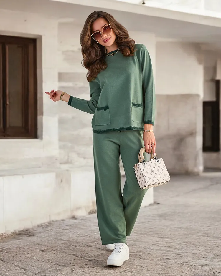 - Ženski komplet puloverjev iz prijetne tkanine. Pulover z okroglim izrezom ima dolge rokave. Široke hlače so z elastiko in se zavezujejo v pasu. Moraš imeti v tej sezoni! OPOMBA: Natančnost meritev (+/-) 1 cm.