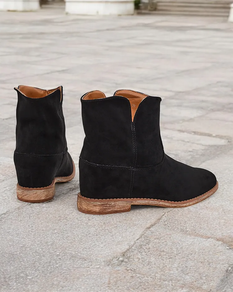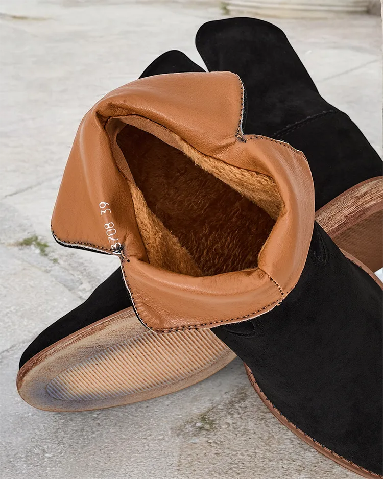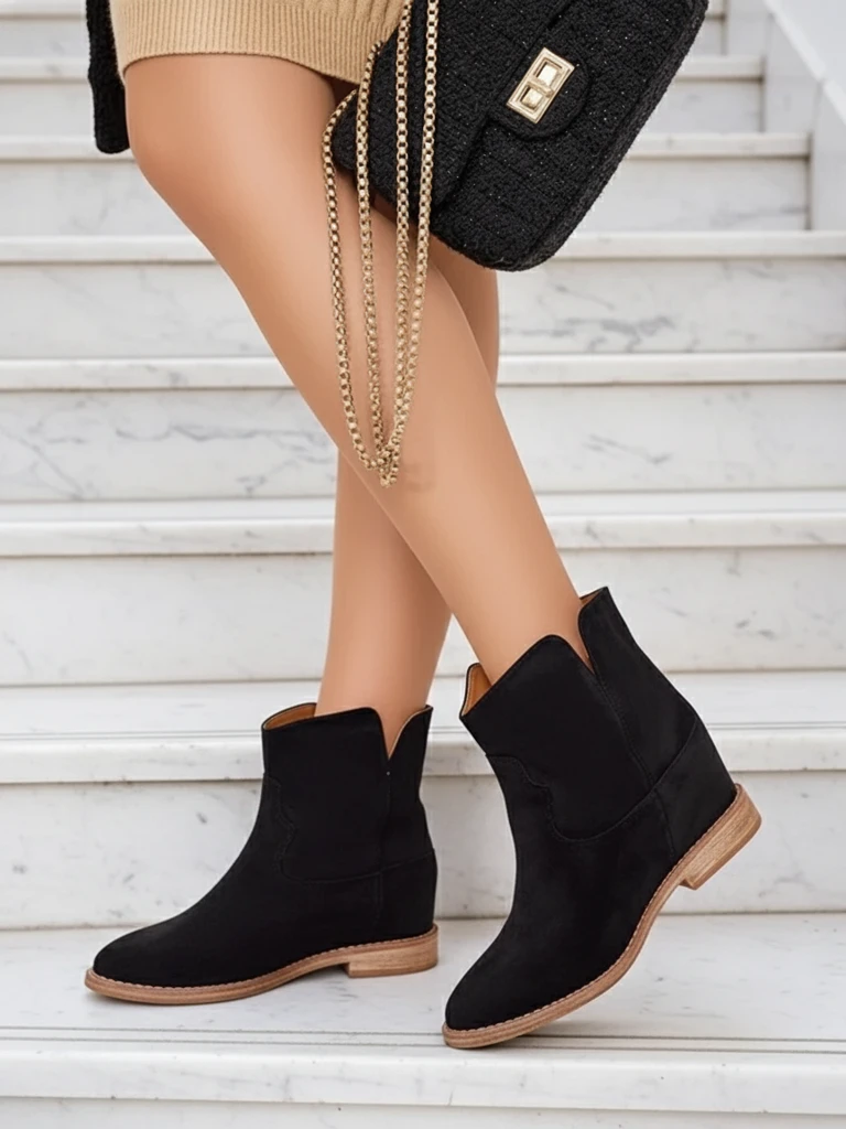 - Klasični kowboy-stil gleženjčki na pokriti peti iz sive eko-suede. Ženski čevlji imajo krzneni podlogi. Gleženjčki so odličen dodatek k hlačam in oblekam!