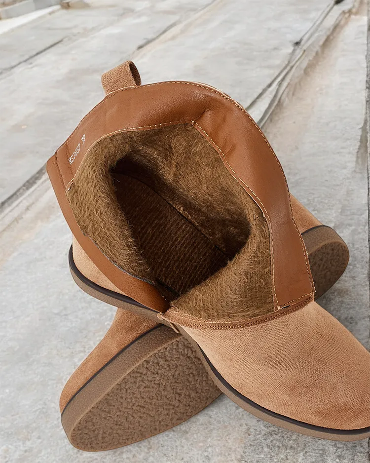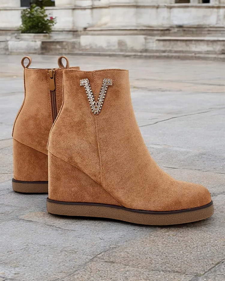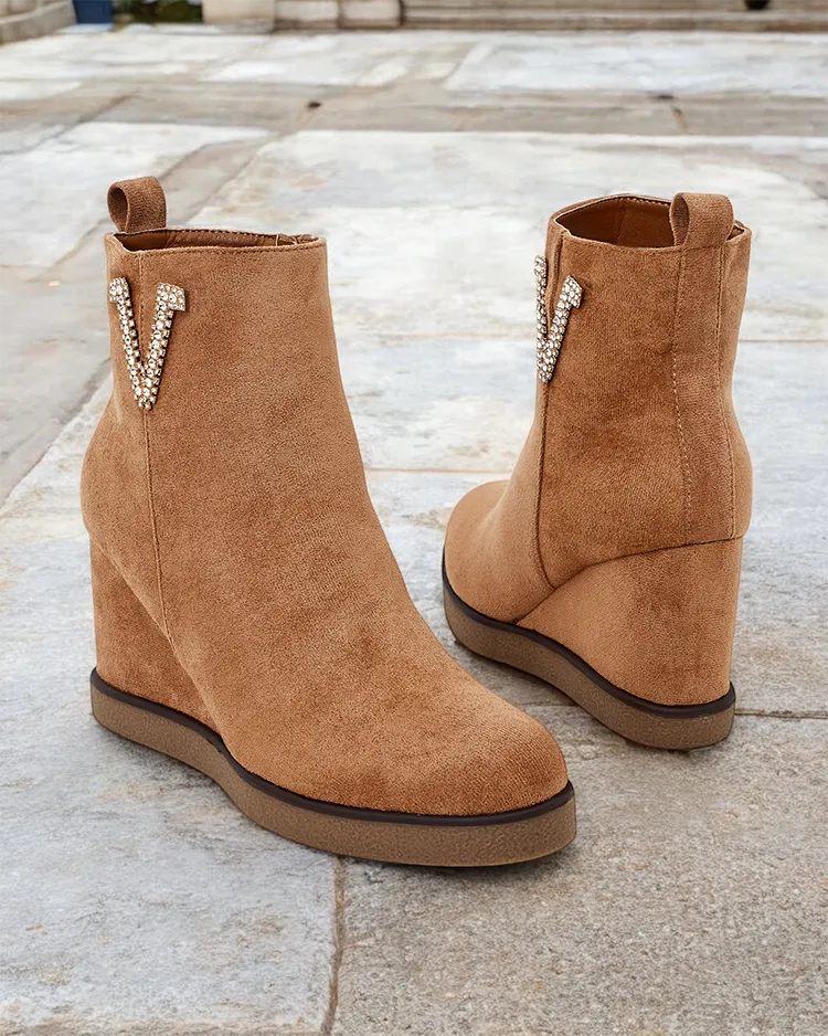 - Elegantni ženski škornji na petah iz eko semiša. Obutev je na notranji strani polnjena s krznom. Odlična izbira za jesen!