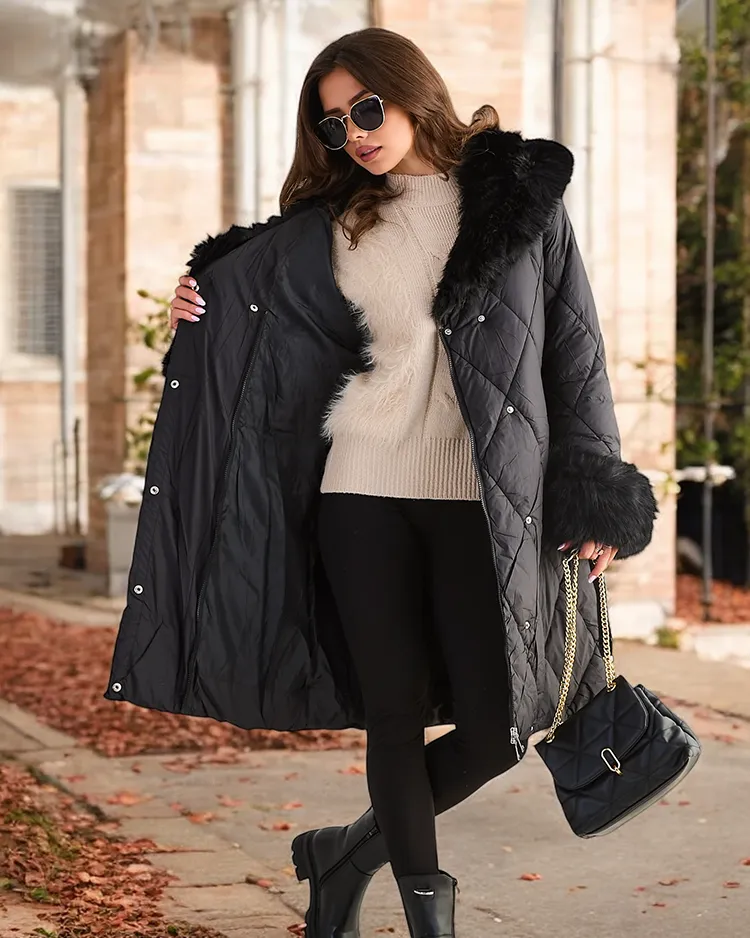 - Topla prošivena ženska zimska jakna s ovratnikom i rukavima ukrašenim krznom i dva džepa. Jakna se zatvara patentnim zatvaračem i kopčama. Model je punjen sintetičkim perjem. Savršeno za zimu!