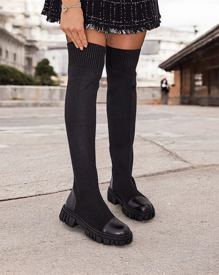 • Elegantne ženske čizme preko kolena na debljem đonu. Gornji deo napravljen je od fleksibilnog materijala sa ekokožnim umetcima, sa tkaninskim uloškom unutra. Model bez pertlanja. Savršen za svakodnevne jesenje outfite!