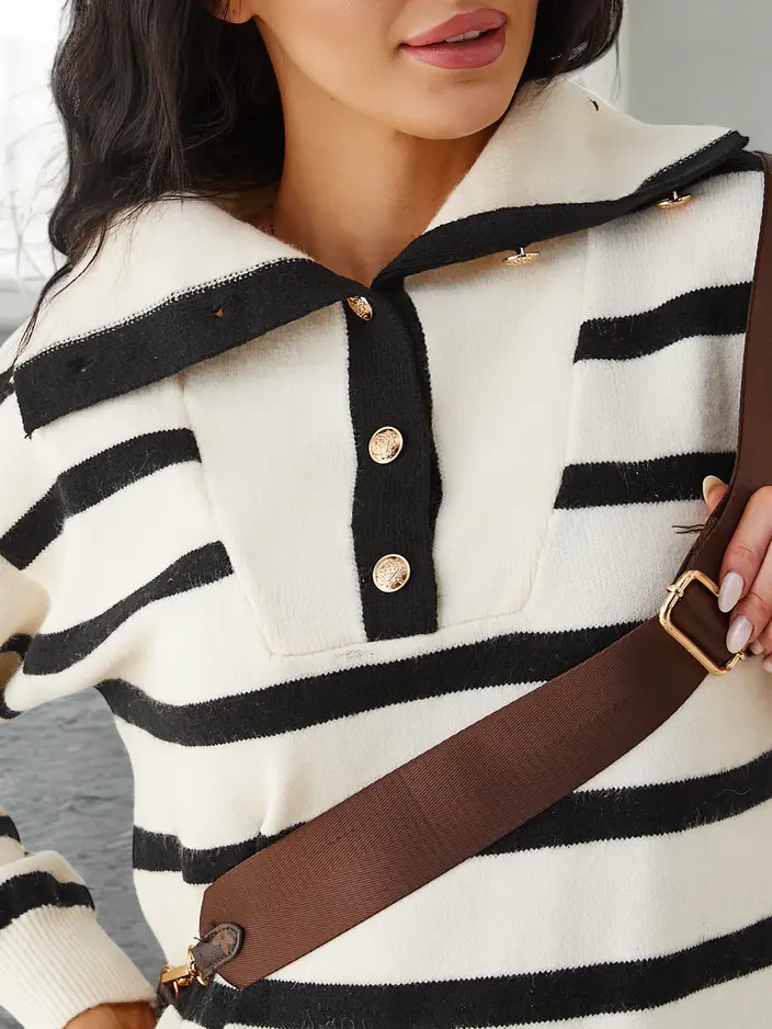 - Ženska midi džemper haljina s dugim rukavima. Model izrađen od pletiva. Vratni izrez kopča se gumbima. Hit ovogodišnje sezone! PAŽNJA: Točnost mjerenja (+/-) 1 cm. Dimenzije mjerene ravnim.