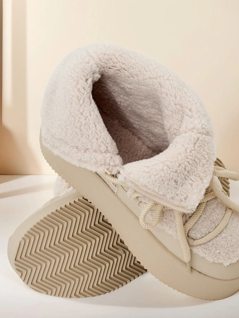 - Ċriepi tal-innevament tal-iskarlata magħmul minn kombinazzjoni ta 'ġilda ekoloġika u materjal pjacir. Fiċċa, hemm linijiet fur ħelu, il-ġwanni għandhom zipper u ġilda laced. Perfett għall-ħarifa!