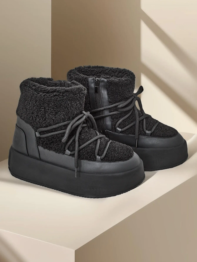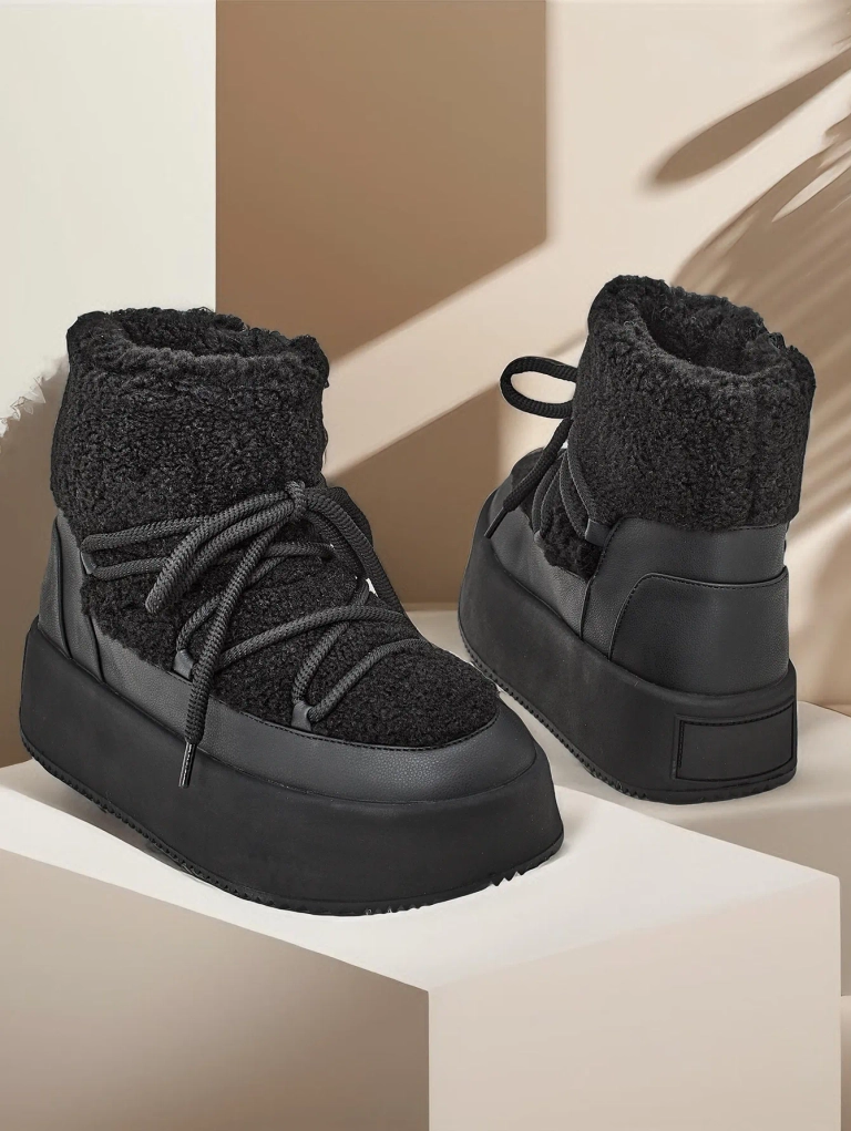 - Ċriepi tal-innevament tal-iskarlata magħmul minn kombinazzjoni ta 'ġilda ekoloġika u materjal pjacir. Fiċċa, hemm linijiet fur ħelu, il-ġwanni għandhom zipper u ġilda laced. Perfett għall-ħarifa!