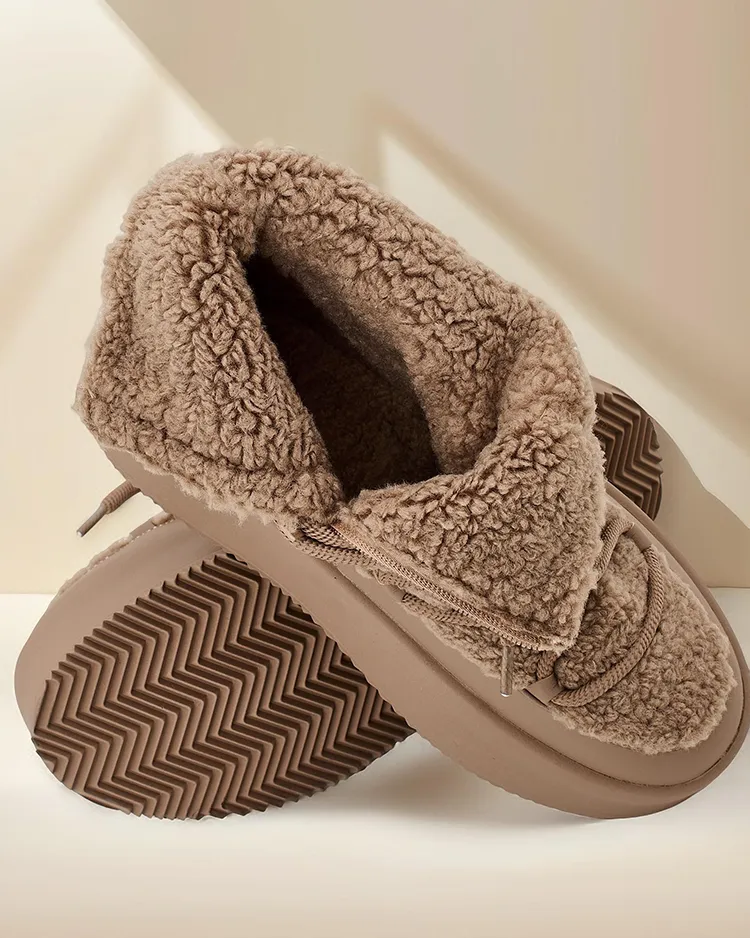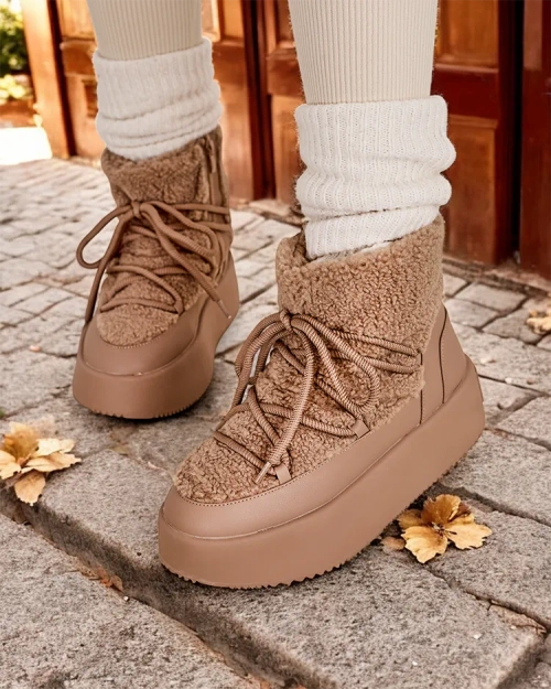 - Ženske snježne čizme s vratima izrađenim od kombinacije eko-kože i ugodne tkanine. Unutar, tu je udobna postava od krzna, čizme imaju patentni zatvarač i vezanu visoku petu. Savršeno za zimu!