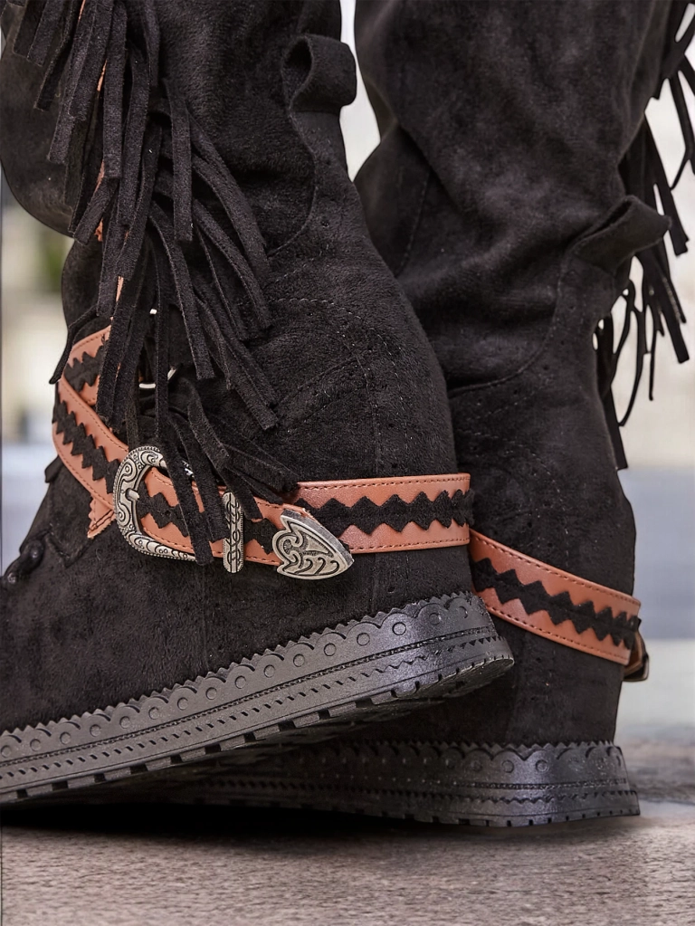 - Stijlvolle lange laarzen voor dames met een verborgen sleehak. De bovenkant is gemaakt van eco-suède leer. Stoffen voering. Instapmodel, versierd met franjes en reliëfbanden.