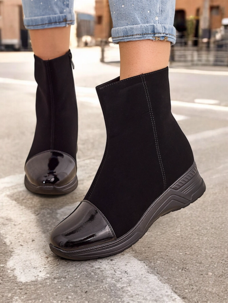 - Stivali wedġijiet sabiħi għan-nisa, imdejqa minn ħiliet ekoloġiċi matte b’tuf imwarrab. L-intern hu mifrud minn fur pleasur. Il-Model hu mfassal b'zipper. Perfett għal xorb tal-ħarifa!