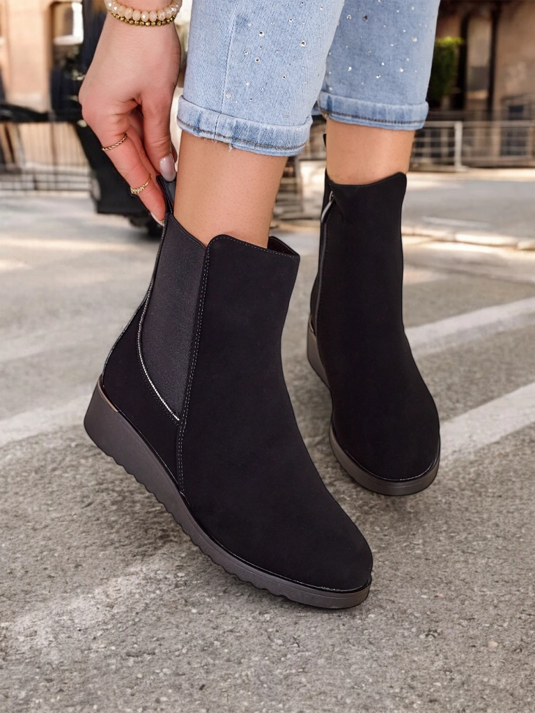 - Fabulozne ženske gležnjače sa potpeticom, napravljene od mat eko kože sa dodatkom sjajne eko kože. Unutrašnjost je od prijatnog krzna. Model se zakopčava zipom i ima ukrasnu gornju stranu sa cirkonima. Savršene za jesenje kombinacije!