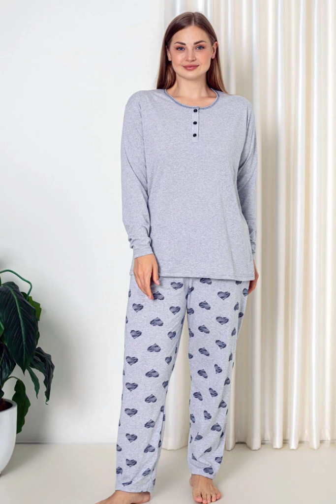 - Ženski 2-dijelni pidžama set izrađen od pamučnog materijala s ukrasnim uzorkom srca. Set uključuje majicu s dugim rukavima i hlače s elastičnom trakom i ravne nogavice.