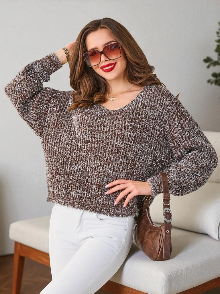 - Ta stilski pulover je bistvo udobja in čara. Narejen iz mehkega materiala, pulover ima V-izrez in dolge rokave. Ohlapen kroj in bleščeča nit mu dajeta edinstven čar!