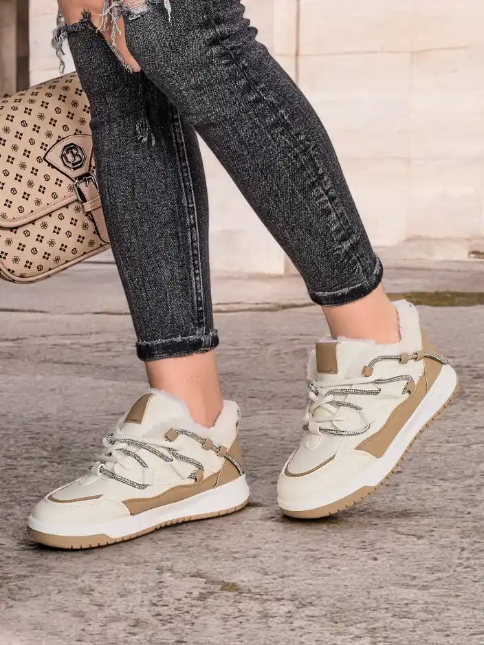 - Ženske izolirane športne čevlje, tip superg, z ravnim podplatom. Model je izdelan iz ekološkega usnja. Vezan zgornji del ima okras z bleščicami. Znotraj je mehko krzno. Odličen dodatek k vašim zimskim vsakdanjim oblačilom!