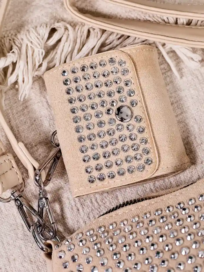 • Elegantna mala ženska torbica okrašena z iglicami. Model z zadrgo, ima 1 predel in 2 žepka. Torbica ima dve odstranljivi naramnici in dekorativno denarnico. Idealna za uradne izhode!