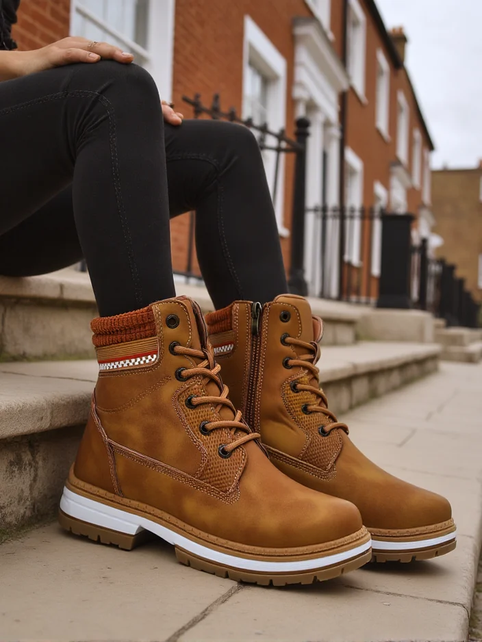 - Ženske pohodne čevlje z vezalkami in zadrgo na strani. Material je umetno usnje. Notranjost čevljev je obložena s krznom. Popolno za zimo!