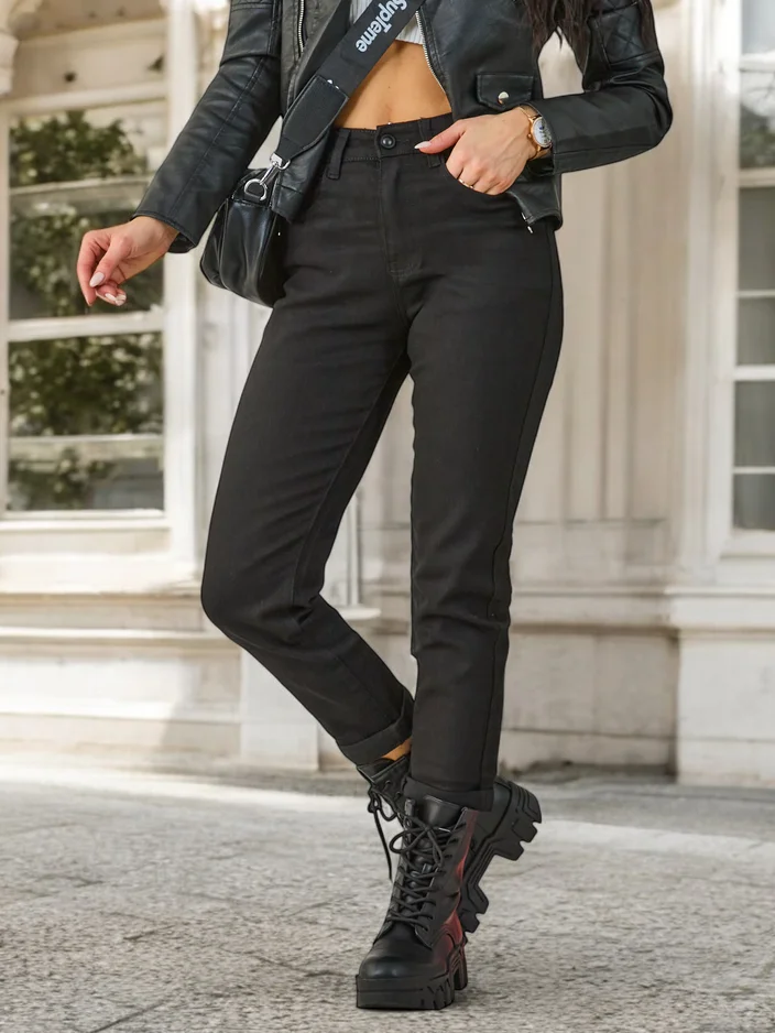 - Elegantne ženske mom kavbojke iz bombažnega materiala. Model ima visok pas, zadrgo in gumb ter 4 žepe. Nepogrešljiv kos v vsakem garderobniku!