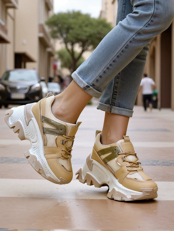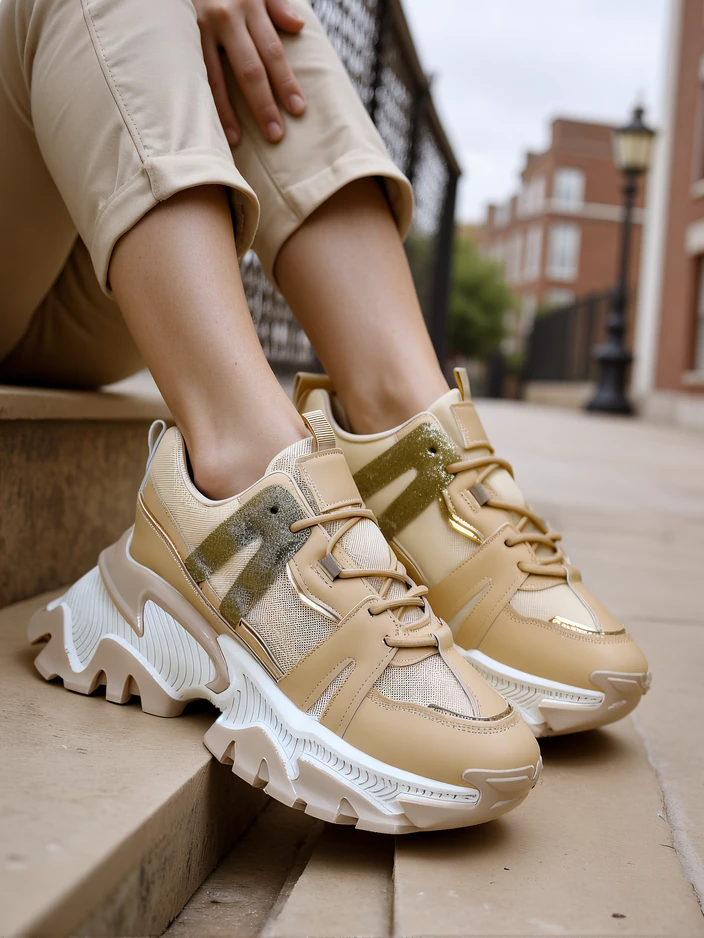 - ženske platforme. Obutev je izdelana iz ekološke usnje s sijočimi vložki in tkaninsko vložkom. Odličen dodatek k vašim vsakodnevnim sproščenim oblekam!