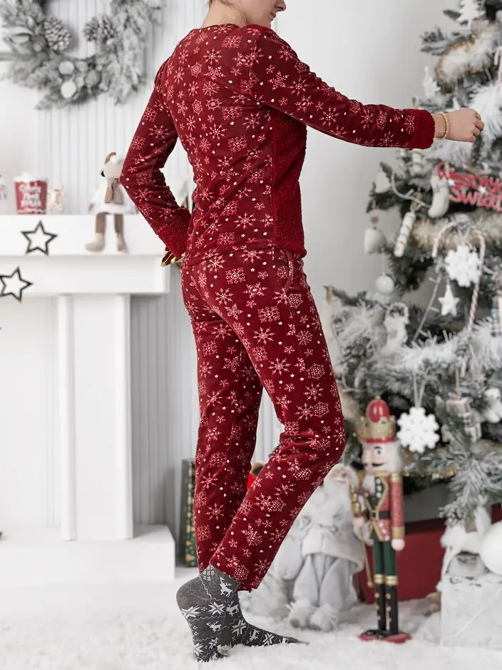 • Ženske 2-delne pižame z dolgimi rokavi in dolgimi hlačami, narejene iz pleteninskega materiala. Model je okrašen s potiskom. Popolno za prijetne večere doma! OPOMBA: Natančnost meritev (+/-) 1 cm.