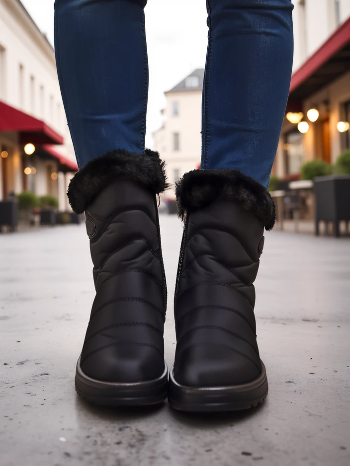 • Čudoviti zimski čevlji za ženske v slogu snežnih čevljev z ravnim peto. Zgornji del je narejen iz tkanine, ki spominja na oljenko, notranjost pa je podložena s krznom. Ideaalna osnova za zimo!