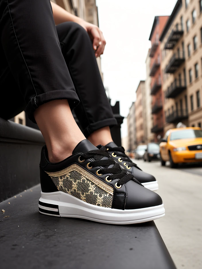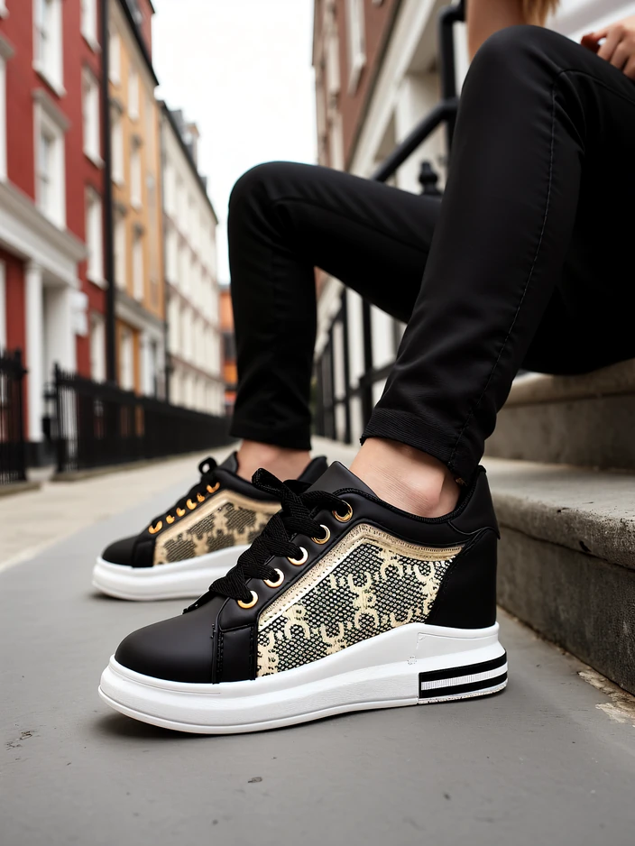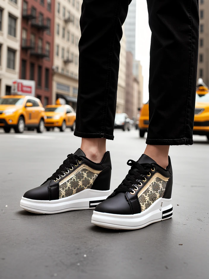 - Udobni ženski športni čevlji s skrito platformo, izdelani iz eko usnja in tiskanega blaga. Model s vezalkami, tkaninska podloga. Elastičen zgornji del se bo nežno prilagodil nogi. Super modna dopolnitev!