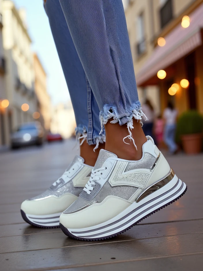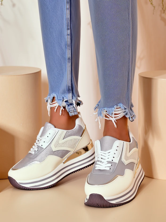 - Ženske športne čevlje v stiletenisk s debelejšo podplatom. Narejene iz eko usnja in bleščečega materiala s tekstilno notranjostjo. Odličen dodatek k vašim vsakodnevnim sproščenim oblačilom!