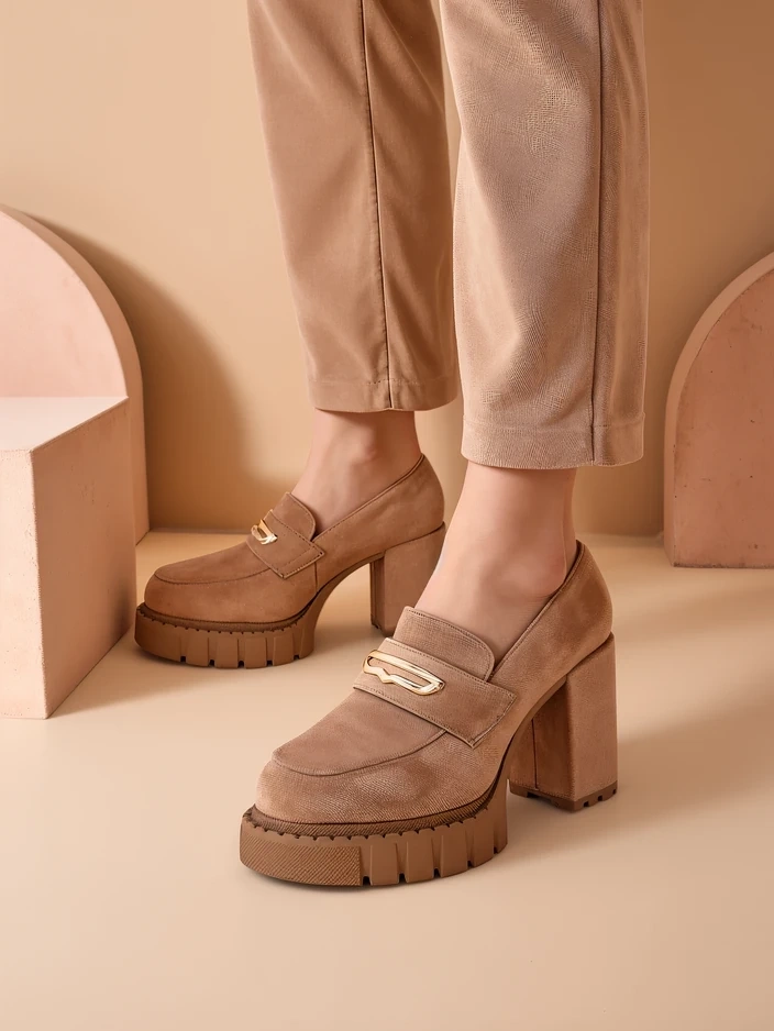 • Klasične ženske natikače s peto. Model je izdelan iz ekološkega semiša. Čevlji imajo subtilno okrasje na zgornjem delu. Idealna osnova za vsakodnevno nošenje!