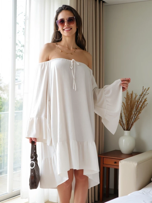 • Neverjetna a'la španska obleka, izdelana iz lahke, zračne tkanine. Model do kolen z dolgimi rokavi, okrašenimi z volani, in elastičnim ovratnikom, ki poudari silhueto. Polna čara in lahkosti!