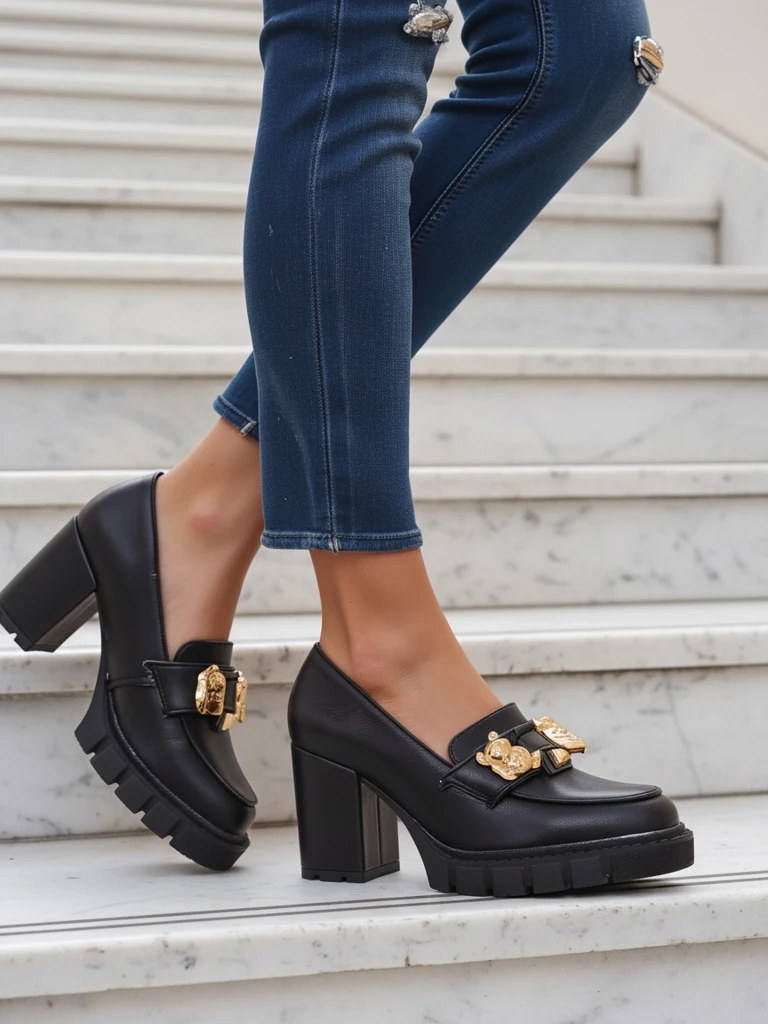 - Klasični ženski mokasini s peto. Model je v celoti izdelan iz eko usnja. Obutev ima subtilen okras na zgornjem delu. Idealna osnova za vsak dan!