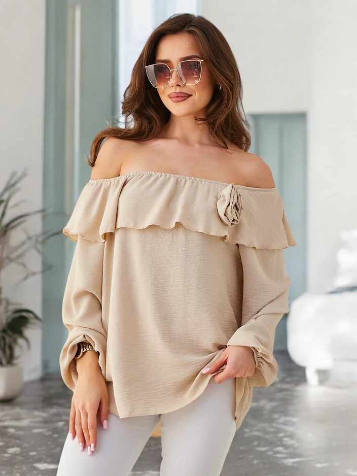 - Bluzka brez naramnic s krilom na ovratniku je elegantna in ženskasta možnost za vsako priložnost. Z elastiko na ovratniku in dolgimi rokavi se popolnoma prilega silhueti ter nudi udobje in svobodo gibanja. Nežna krila dodajajo lahkotnost in čar!