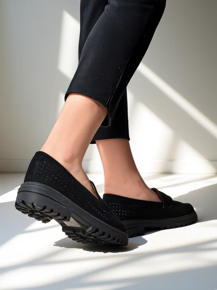- Perforirane ženske mokasine na ravnem podplatu. Model je narejen iz ekološkega umetnega usnja s polnjenjem iz ekološke kože. Idealna dopolnitev vsakdanjih oblačil!
